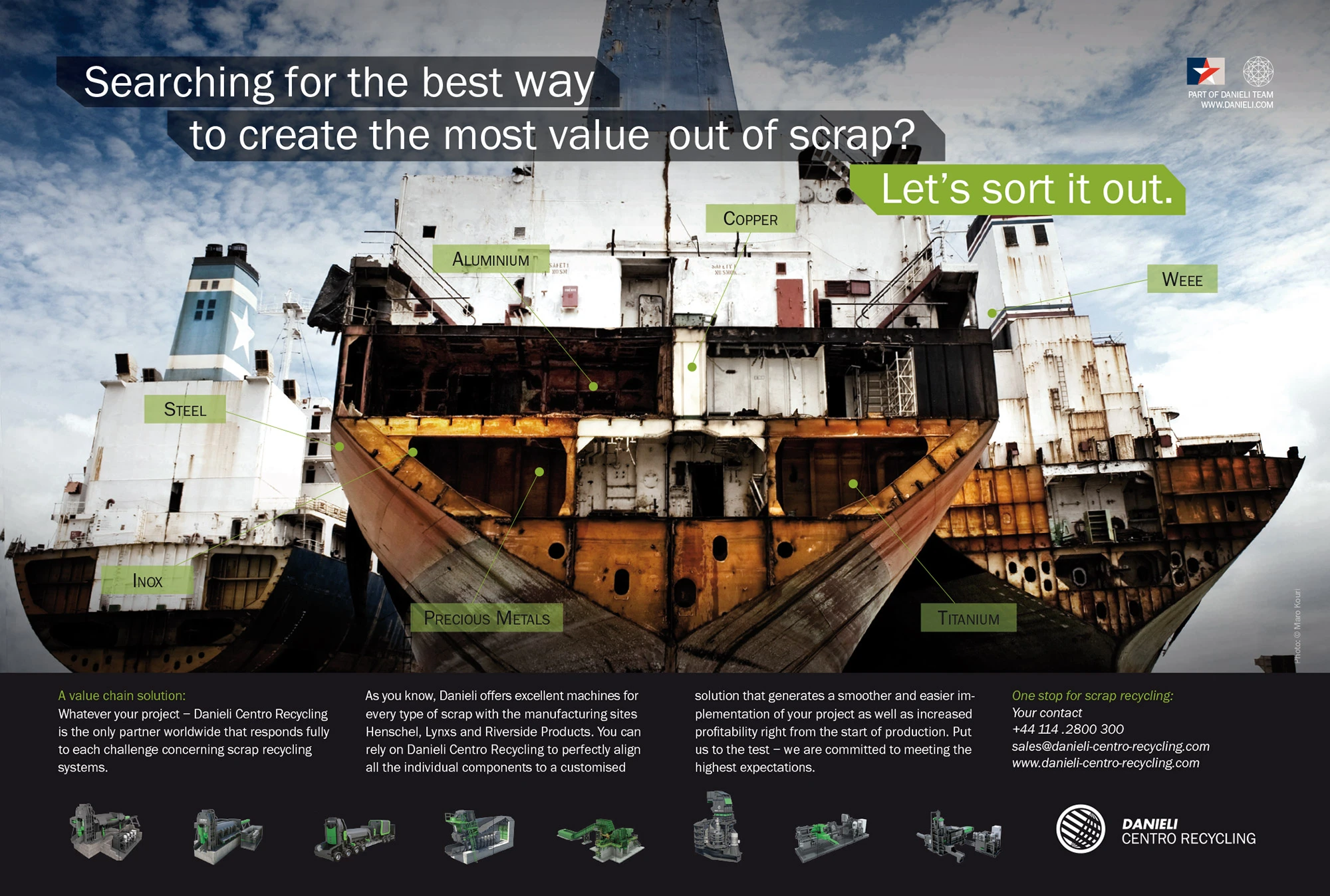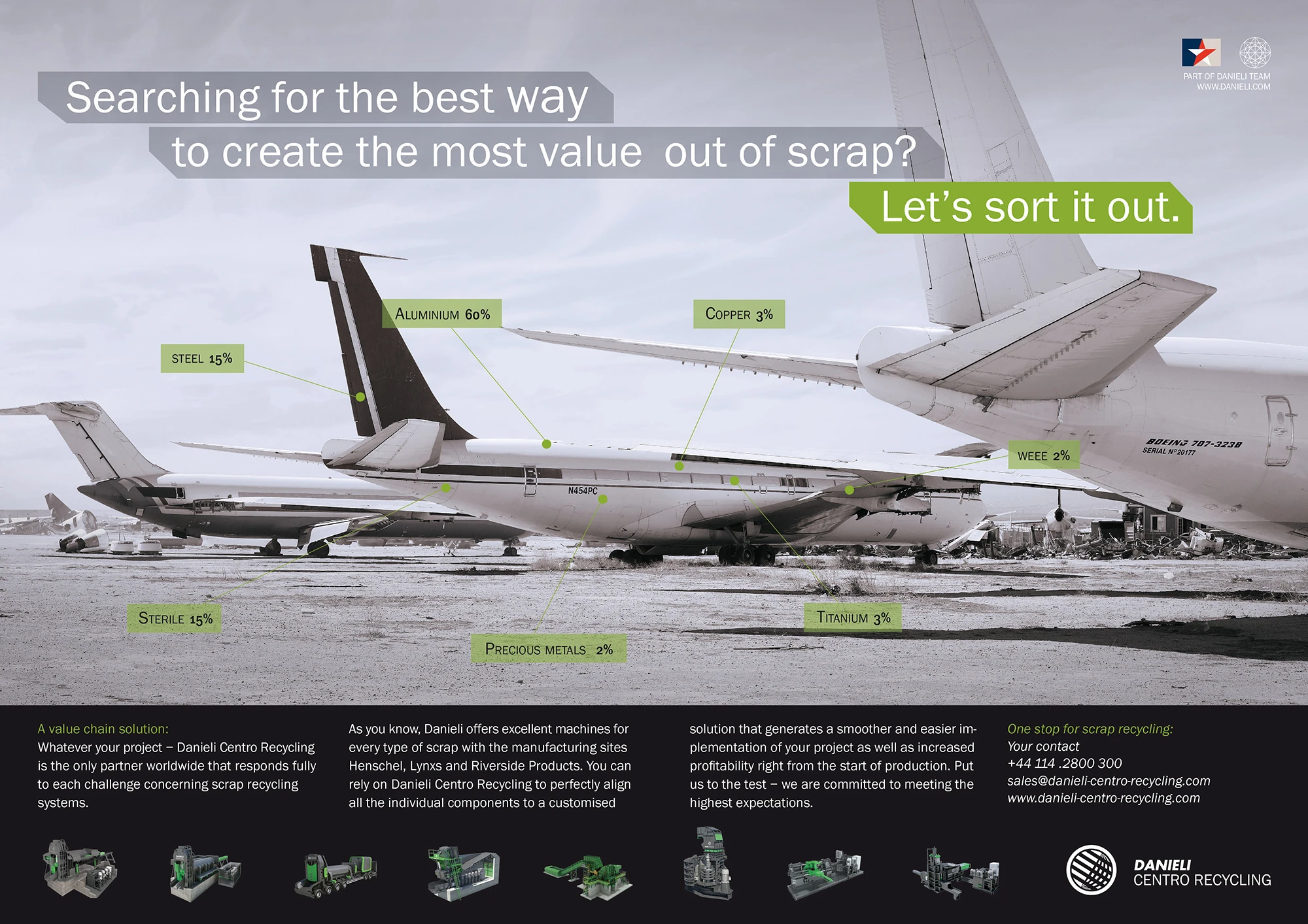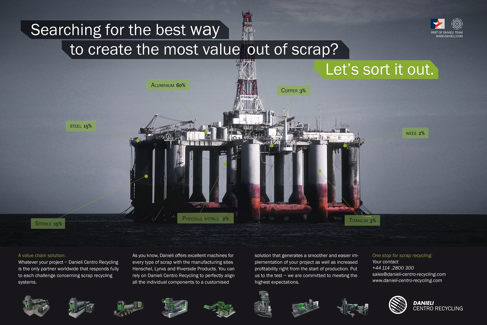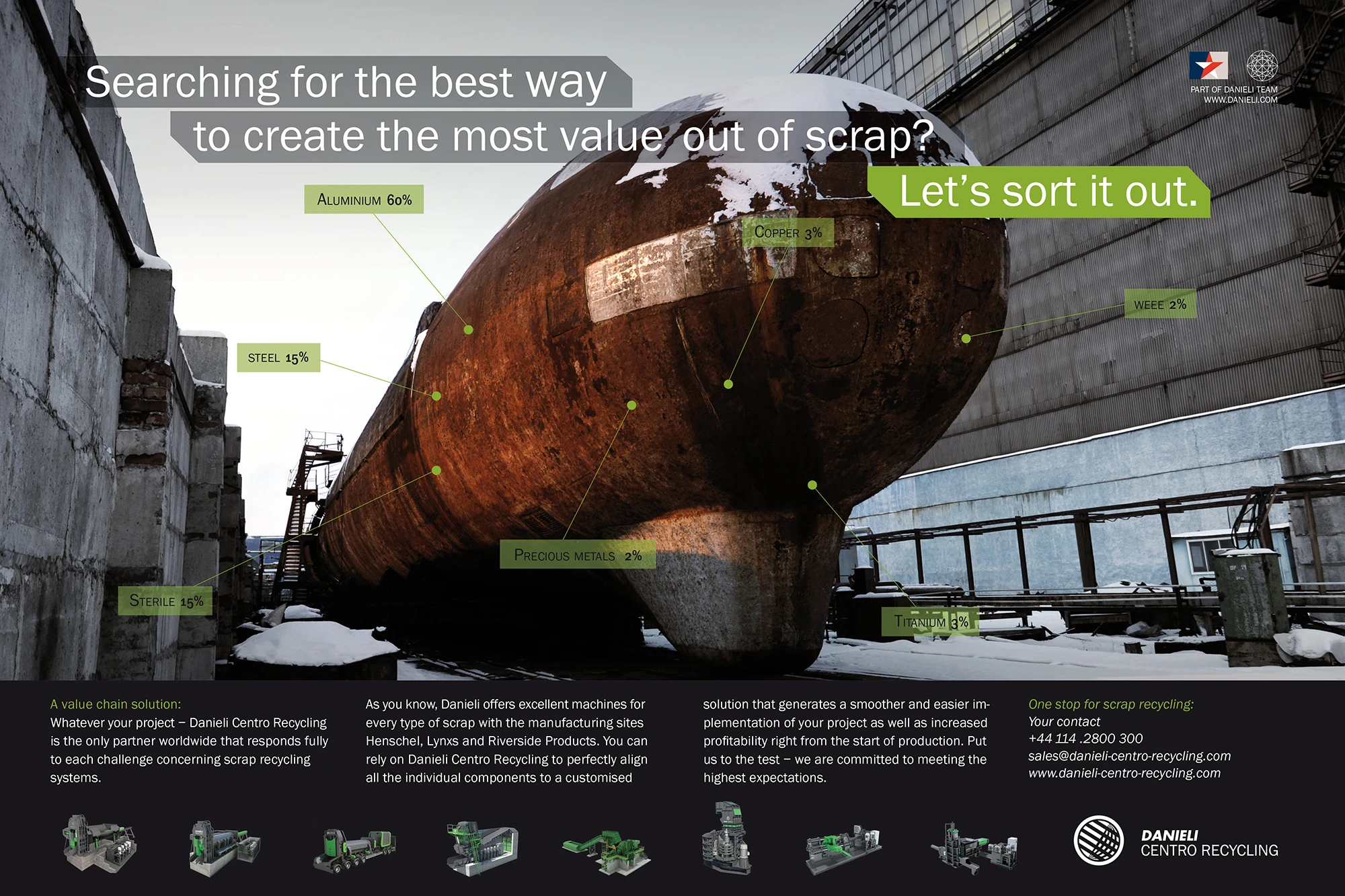 Danieli ist ein weltweit operierendes italienisches Unternehmen für Recyclingmaschinen. Der Konzern ist führend, wenn es um die Verarbeitung von Abfällen und Schrott geht und sichert seinen Kunden maximale Wertschöpfung bis zum kleinsten Aluminiumschnipsel.