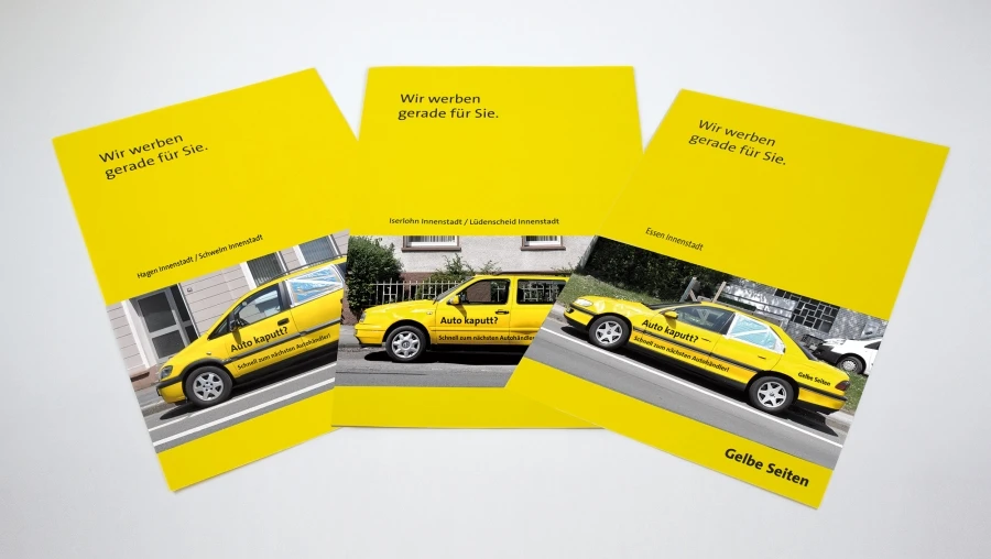 Zwei Monate nach Ideenpräsentation tauchten in etlichen Städten des Ruhrgebiets demolierte gelbe Autos auf, die für die Werkstätten-Suche in den Gelben Seiten warben.