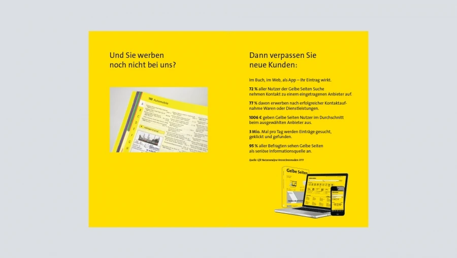 „Gelbe Seiten“ - Das Branchenbuch für Deutschland gibt Auskunft zu Adressen und Firmen-Infos. Neben dem bekannten Print-Katalog sind zahlreiche (digitale) Webemöglichkeiten Bestandteil des Angebotes. Unser Kunde ist der Sutter-Verlag, der die Gelben Seiten in NRW vertritt.